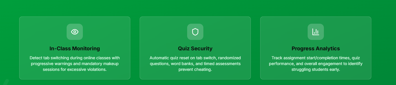Monitor student attention during online classes, track quiz behavior with tab-switching detection, automatically enforce engagement policies, and provide detailed progress insights to instructors.
